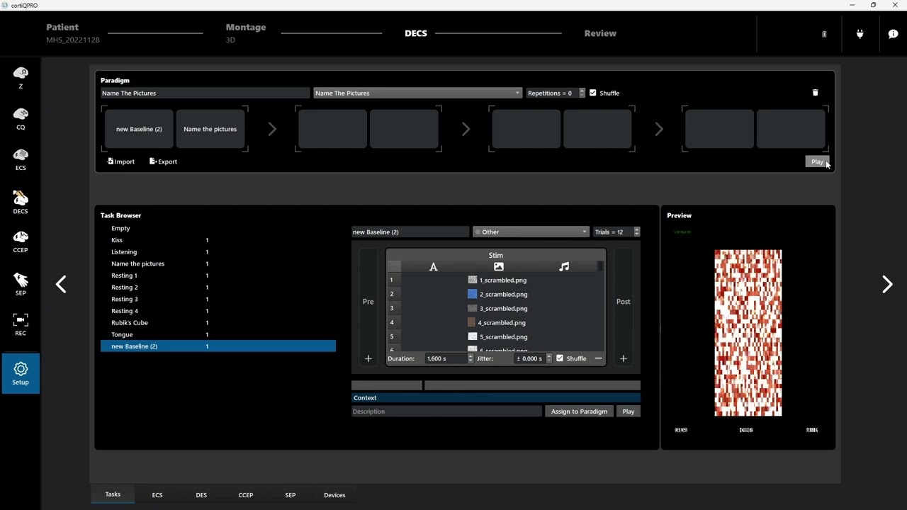 cortiQ 2.0 allows you to set up your own experimental paradigm. The video demonstrates an expressive language mapping paradigm configuration, using scrambled images to record baseline activation versus real images that need to be named. The scrambled and real images are matched for color intensity.
