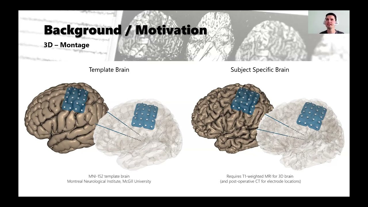 The ECoG grids can be selected from a library and placed by drag-and-drop over the corresponding cortical regions. The key is to position them precisely onto landmarks provided by the underlying picture. Afterwards, the grids are projected onto a 3D mesh of the cortex. In the next step, the patient is instructed to perform certain tasks, while the high-gamma signal is statistically evaluated to indicate cortical regions responsible for the task.