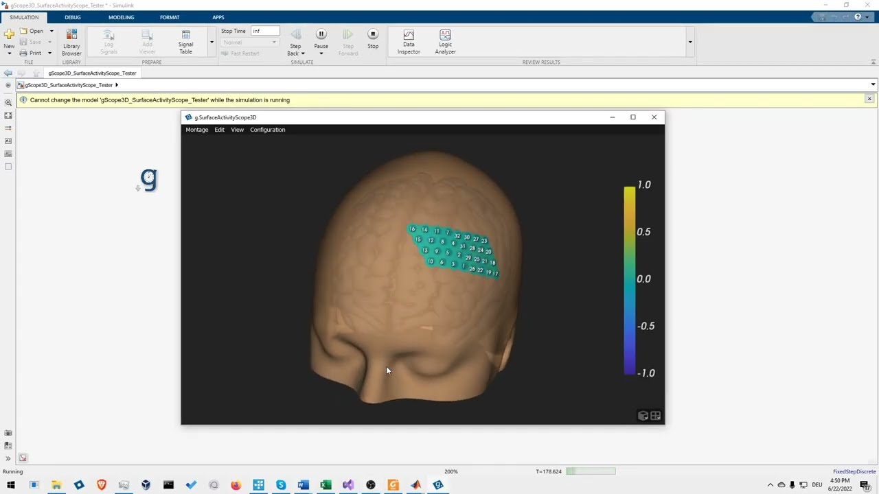 In Simulink, every amplifier is set up with a certain, individual sampling frequency. The amplifier block delivers the data samples in real-time to a Scope, to the signal analysis or to store the data. This allows you to work with more than 256 channels e.g. for ECoG studies, and it also allows you to record from multiple users at the same time on one single computer. This makes the online data quality control much easier, requiring only one computer for data storage that can analyze data from multiple users.