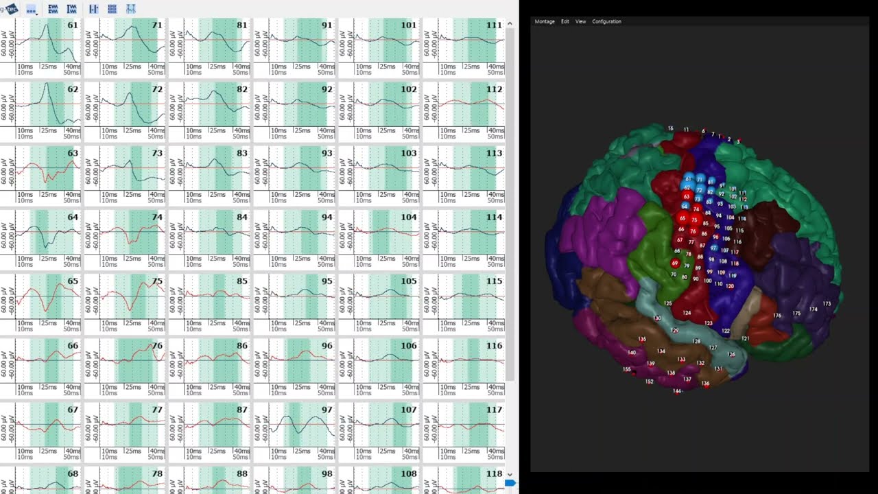 In this video a patients’ hand receives vibro-tactile stimulations while the ECoG is recorded and analyzed. The EP scope shows the evoked potentials coming from the ECoG signal and the phase reversal between the sensory and motor cortex which defines the central sulcus. Of special importance is that just a few stimuli are needed to produce the result because the noise floor of the equipment is very small because of the high oversampling technique done in the g.HIamp.
