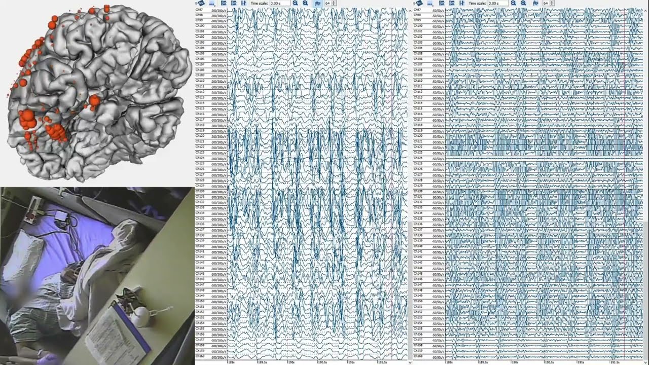 In this video g.HIsys is used to monitor an epilepsy patient with ECoG implants. The left scope shows the raw ECoG data recorded and the right scope show the high-gamma filtered ECoG. After a few seconds a seizure starts to spread out from the middle of the brain to all the recording sites. The bubble scope is use to show significant changes of activity and it shows very nicely the propagation of the seizure in real-time.
